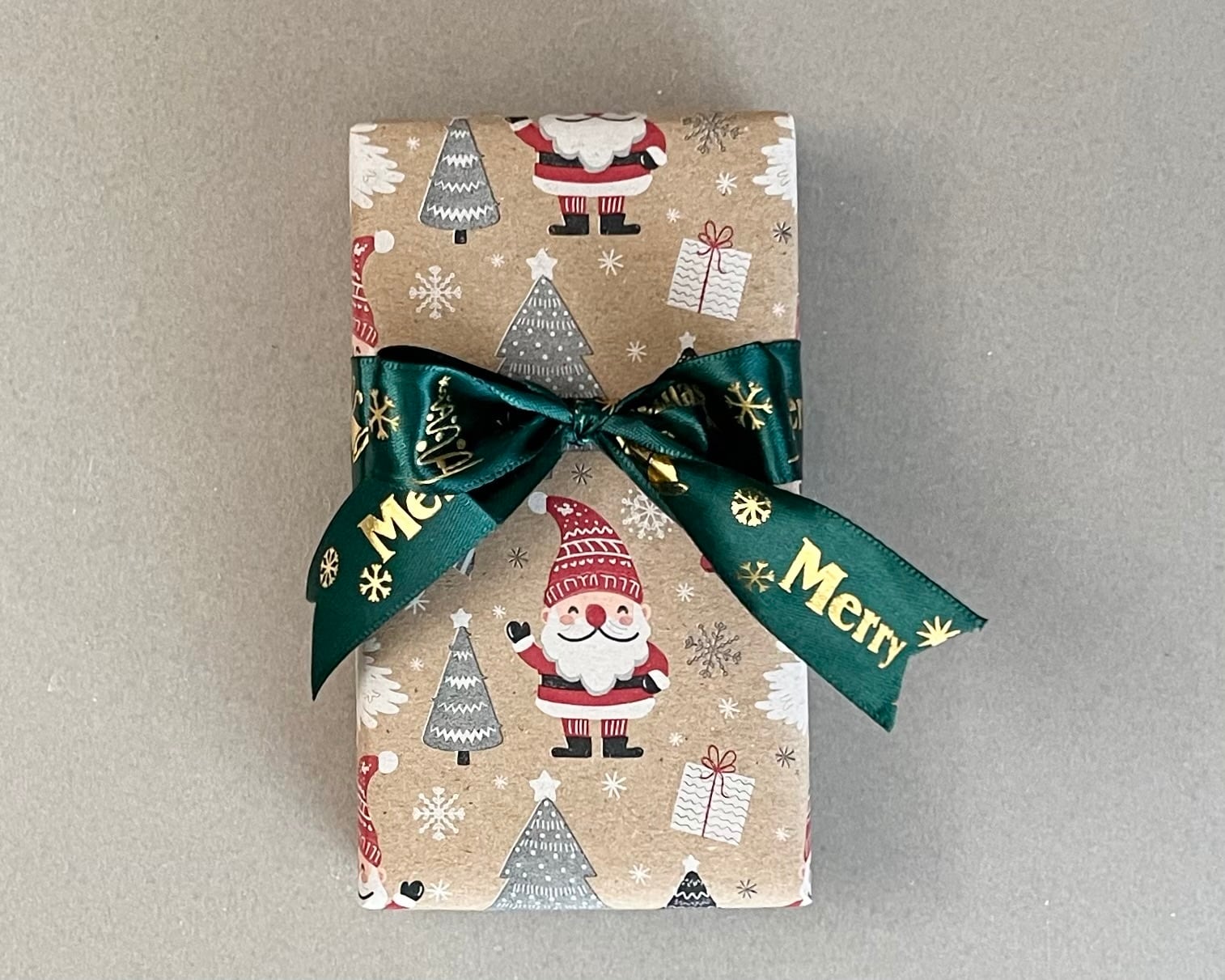 サンタが描かれた可愛いクラフト紙にクリスマス仕様のリボンを巻いた限定ラッピング。