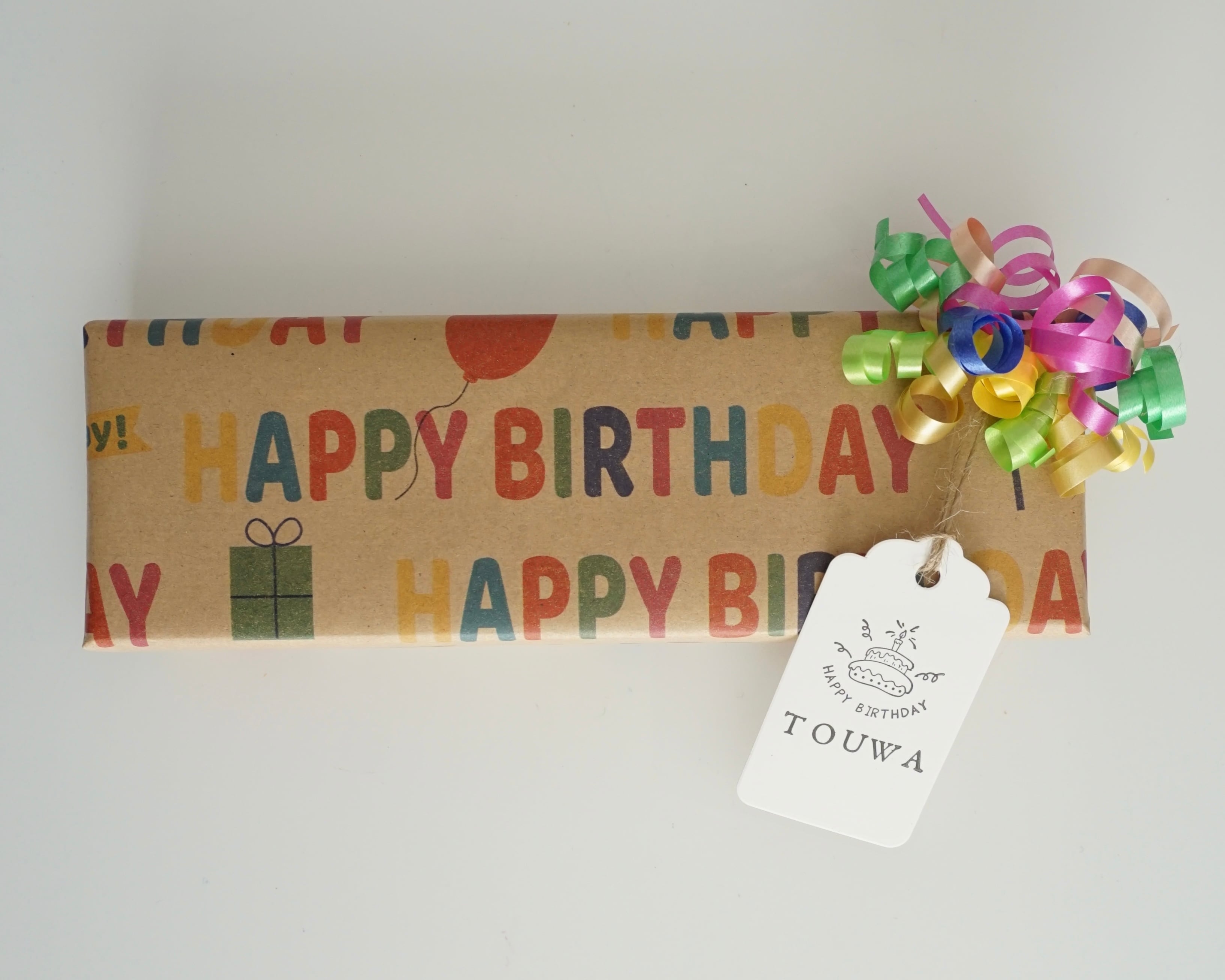ハッピーバースデーのラッピング紙を華やかに彩るカーリングリボンとメッセージタグがつきます。